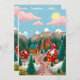 Une adorable ville aux nuages roses et aux maisons rouges en brique et aux montagnes enneigées dans la carte de Noël arrière - plan. Ajoutez votre propre salutation de vacances personnalisée et les noms au dos de la carte de vacances dans la zone personnalisée.