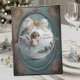 Cette carte de vœux présente une illustration de style vintage d'un ange serein, les mains jointes en prière, vêtu d'une robe blanche fluide et couronné d'un ruban céleste d'or et d'ivoire. Encadrée de filigranes ornés et nichée parmi les branches de pin et les baies d'hiver, elle se dresse contre un ciel sarcelle doux - un emblème de paix et de présence divine. Les mots « Joyeux Noël » scintillent comme une bénédiction chuchotée, invitant le destinataire à un moment de réflexion et de chaleur. Parfaite pour envoyer des vœux sincères, cette carte porte l'esprit d'une dévotion silencieuse et la douce magie de la saison.