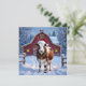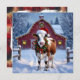 Une jolie carte de Noël avec l'illustration d'une vache festive dans un chapeau de Père Noël debout devant une magnifique grange rouge ornée de lumières de Noël et d'une couronne festive pendant une journée d'hiver enneigée. Vous pouvez ajouter vos propres voeux, nom et adresse de vacances personnalisés dans la zone personnalisée.