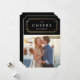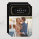 Envoyez un peu de gaieté de vacances avec un carte photo moderne et chic! Cette décoration d'inspiration art déco est décorée dans des tons noir et or avec une touche de fausse feuille d'or entourant le mot "Cheers". Déco est le design de vacances idéal pour les jeunes mariés ou les couples qui fêtent ensemble leur nouvelle vie ! Pour une personnalisation plus avancée de ce design, il suffit de cliquer sur le bouton "Customiser" ci-dessus ! Toutes les photographies sont affichées sous forme d'échantillon seulement et ne sont pas destinées à la revente. Ce produit n'est destiné à être acheté qu'une fois que des échantillons de photos ont été remplacés par vos propres images.