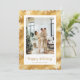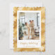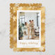 Magnifique carte de vacances en or avec des flocons de neige, des étoiles et des chutes de neige sur un arrière - plan en fausse feuille d'or. Personnalisez facilement cette carte de vacances photo avec votre photo et votre texte.
