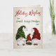 Cartes de voeux pliées de style rustique avec "Voeux de Vacances" dans script de calligraphie élégant avec vos noms personnalisés et année. Ce design unique a une famille de gnome aquarelle, habillé pour l'occasion, dans leurs tenues de vacances colorées rouge, vert et or, le tout sur un support en papier artisanal vintage. L'intérieur de la carte contient des espaces texte pour votre message personnalisé, votre nom de famille et votre année. Modifiez facilement la conception pour ajouter, supprimer et ajuster les gnomes en fonction de la taille de votre famille. Disponible en version papier pour diffusion standard ou format de téléchargement numérique pour envoi rapide et facile par SMS ou e-mail.