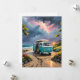 Une camionnette est garée sur une plage avec des fleurs colorées et des arbres qui l'entourent, tandis que des nuages dramatiques de tempête se détachent pour révéler la lumière qui traverse le ciel. La scène contraste entre l'atmosphère turbulente et le cadre balnéaire paisible.