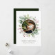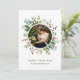 Cette photo Noël | Carte de vacances avec des eucalyptus à aquarelle peinte, des feuilles verts, des baies rouges, des branches de pin et un cadre de cercle blanc avec texte facultatif à l'arrière. Pour une personnalisation plus avancée de cette conception, cliquez sur le lien "customiser plus loin". Des articles correspondants sont également disponibles.