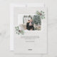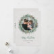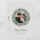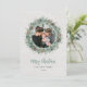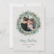 L'élégant design carte photo de vacances "Joyeux Noël" dispose d'un arrière - plan rustique chic à grains de bois blanc avec une couronne ronde de verdure d'hiver aquarelle encadrant le tableau de famille et accentue la formulation moderne vert et gris charbon. Personnalisez avec votre nom de famille et l'année. Inclut un message supplémentaire avec les noms des membres de la famille et la photo de paysage bonus au dos de la carte.