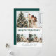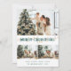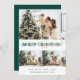 Cartes photos de Noël Joyeux vert personnalisé avec un collage photo avec un titre décoratif et des lumières de Noël sur le devant et vert foncé arrière - plan avec la neige tombée à l'arrière. Personnalisez facilement ces cartes photos de Noël vertes avec vos images, un nom de famille et l'année.