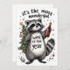 Un design de Noël drôle et gai présente un joli raton laveur debout devant un sapin de Noël festif, tenant une bouteille de vin rouge. Le texte écrit à la main dit : "C'est le vin le plus merveilleux de l'année." Ce design charmant est disponible sur une variété de produits, ce qui en fait un cadeau parfait pour les amateurs de vin.