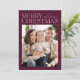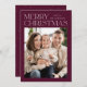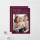 Carte photo moderne de Noël avec "Joyeux Noël" affichée en haut du design en lettres blanches tendance avec un arrière - plan couleur vin. Personnalisez la simple carte de Noël avec votre nom de famille et votre photo. La carte inverse pour afficher un arrière - plan de vin avec des points blancs subtils (neige).