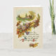 L'image vintage de la carte de voeux Thanksgiving présente une scène campagnarde paisible avec une petite église blanche en arrière - plan et une guirlande de fleurs et de feuilles d'automne au premier plan. Le verset sur le devant de la carte dit : "Quand les temps de récoltes sont riches, réjouissons-nous le jour de Thanksgiving." Le message à l'intérieur de la carte est : "Remercier Dieu pour ses bénédictions généreuses."