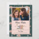 Illustration d'une maison moderne rose du milieu du siècle décorée de lumières de Noël. Le fond est orné d'un motif de cannes à sucre, de maison, de flamants roses et de flocons de neige. Personnalisez avec votre photo de famille.