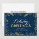 Cette carte de vœux de Noël d'entreprise est le moyen idéal pour toute entreprise d'exprimer sa gratitude à ses clients. Le recto présente un feuillage doré de fêtes sur un fond bleu foncé, avec un texte élégant qui dit "Vœux de fêtes". Vous pouvez personnaliser le verso avec votre propre message ou opter pour le message de remerciement simple fourni.