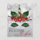 Carte de vœux de fêtes | Meilleurs vœux de fêtes dans une police contemporaine et une calligraphie moderne. Un arrière-plan bokeh argenté scintillant met en valeur cette belle tête de licorne verte et or décorée. Elle a de beaux yeux verts scintillants avec de longs cils et une corne et des oreilles rayées dorées et vertes brillantes. - elle porte un diadème floral de poinsettias rouges, de houx et de lys rouges - Personnalisez le texte en bas ou vous pouvez le supprimer - C'est un modèle de fêtes non confessionnel adapté à la famille ou au bureau. Tous les travaux artistiques originaux © par WhimsicalArtwork™. Ceci fait partie d'une collection de fêtes coordonnée à assortir.