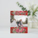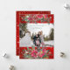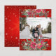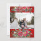 Carte de vœux de saison avec photo. Élégante et riche composition florale avec des cônes de pin sur un fond rouge à paillettes en forme de flocon de neige. C'est une carte de vœux personnalisée avec votre propre photo et message.