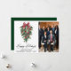 Modern Elegant Calligraphy Ink Script Watercolor Pines Winter Greenery with Burgundy Red Ribbon Bow Christmas Ornaments, Pine Cones and Holly Berries Company Photo Happy Holidays Card - Green