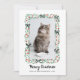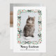 This simple and stylish cat lover holiday card features your favorite photo of your pet kitten, surrounded by a cute, whimsical hand-drawn frame with red and green foliage and holly berries, and trendy black bows. Funny and elegant modern script says "Meowy Christmas." There is room for a second photo on the back, along with a personal message to family and friends.