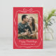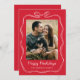 Send holiday cheer with this whimsical Happy Howlidays Christmas photo card featuring your photo framed by a hand-drawn white ribbon and bow. The playful design displays “Happy Howlidays” in a handwritten script on a festive red background. Personalize with your family name below and add a photo of your dog or a family portrait including your furry friend. The back includes space for an extra photo and message, creating a fun and heartfelt card for pet lovers.