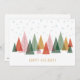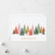 Un design minimaliste qui présente une forêt colorée d'arbres stylisés et géométriques sous des flocons de neige tombants. Les couleurs vives et les formes modernes créent une atmosphère de vacances joyeuse et festive.