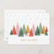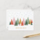 Un design minimaliste qui présente une forêt colorée d'arbres stylisés et géométriques sous des flocons de neige tombants. Les couleurs vives et les formes modernes créent une atmosphère de vacances joyeuse et festive.