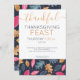 Woodland Leaf Motif Thanksgiving Dîner invitation de Ricaso Ce délicieux dîner de vacances invitation avec un délicat détail de police de défilement en or avec le mot "remerciant" - et un motif de feuille bleu, rose, vert et or à l'avant et à l'arrière