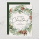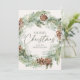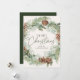 Elégante carte de vacances avec une couronne d'aquarelle de pinecones, de pinèdes et de verdure luxuriante avec un arrière - plan crème légère. "Joyeux Noël" est affiché dans un script vert foncé avec votre nom ci-dessous. La carte de vacances non photo s'inverse pour afficher votre message personnel sur un arrière - plan vert foncé.