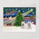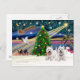 La magie de Noël avec deux West Highland Terriers montre l'étoile de Bethléem guidant trois hommes sages tandis que Père Noël et ses rennes volent dans la nuit et une colombe de paix flotte dans la lumière étoilée. Un sapin de Noël et un bonhomme de neige ajoutent aux symboles de la saison des fêtes.