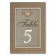 Cette carte de numéro de table comporte un arrière - plan qui ressemble presque à un cadre autour de la partie principale du design. Un burlap plus léger est utilisé dans le "cadre" où un coeur apparaît avec vos initiales monogrammées dessus. Le tableau des mots apparaît ci-dessous, tout comme un nombre que vous pouvez customiser. Il s'agit d'une carte de numéro de table mariage burlap look très unique. Copyright henishouseo