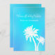 Cartes de Noël plates aux tons bleus aqua tropicaux avec des palmiers en silhouette blanche et texte. Personnalisez un message et ajoutez une signature à des cartes de vacances simples et uniques avec un thème tropical. Le verso est bleu.