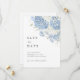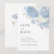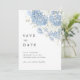 Ce modèle de faire-part de mariage "Save the Date" bleu poussiéreux et blanc présente des florales d'hortensia à l'aquarelle douce avec une mise en page élégante et épurée.