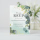 Cartes de réponse de mariage vertes élégantes avec un fond délavé à l'aquarelle, des feuilles de eucalyptus botaniques, des éclaboussures de faux foil doré et un modèle simple de rsvp de mariage.