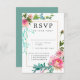 Très élégant et chic. Un mince cadre doré entoure les options de réponse et de repas. Des pivoines roses modernes peintes à l'aquarelle décorent le cadre. Le contour rose framboise sur certaines des pivoines donne au design floral une ambiance très branchée. La vigne de feuilles ouvertes sarcelle qui descend le long du côté apporte une touche florale moderne. J'ai choisi un fond bleu sarcelle pour compléter le design floral. Vous pouvez le garder ou le changer pour n'importe quelle couleur de fond.