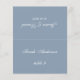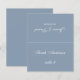 Un carton de table de mariage bleu poussière simple avec le nom de l'invité et le numéro de table imprimés sur l'avant et les noms des mariés et la date de mariage imprimés sur l'autre face (c'est l'autre moitié avant pliage). Tout le texte est en blanc.