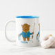 Une mignonne tasse pour les enfants avec un ours caricatural brun avec une canne de pêche dans une main et un seau rempli de poissons dans l'autre. Personnalisez-le avec le nom de l'enfant. © ArianeC Illustrations-Tous droits réservés