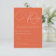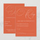 Cette carte RSVP magnifiquement conçue est le complément parfait à votre suite de faire-part de mariage Verona Sunset. Avec un fond terracotta chaud et vibrant et une écriture blanche élégante, cette carte permet à vos invités de répondre facilement tout en conservant l'esthétique romantique et cohérente de votre mariage. Au verso, il y a un espace pour que vos invités indiquent leur choix de repas, assurant un processus de planification fluide et organisé pour votre jour spécial.