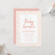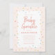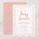 Un carton d'invitation de baby shower fantaisiste pour une baby sprinkle avec une bordure de paillettes arc-en-ciel sur fond rose blush.