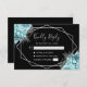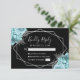 This elegant wedding RSVP card features a silver geometric frame decorated with aqua and silver floral bouquets on a black background. The customizable text combines silver gray whimsical handwriting and copperplate fonts. The reverse side is solid black.