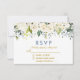 Watercolor Ivory White Floral Greenery Wedding Carte RSVP inclut des roses blanches crème d'ivoire et de la verdure botanique. Script or, dossier bleu Dusty