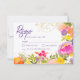 Invitation vos invités à répondre avec style avec notre luxueuse carte jardin Quinceañera RSVP. Ce design présente des fleurs d'été peintes à la main, dont des pivoines et des roses vibrants, entourées de verdure luxuriante et de confettis scintillants. La police brossée moderne apporte une touche chic et sophistiquée, ce qui en fait l'ajout parfait à votre suite d'invitation Quinceañera.