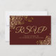 Ces belles cartes RSVP vous permettront de répondre facilement à vos faire-part de mariage. Elles présentent un design simple mais élégant avec des lettres en or sur un arrière - plan de couleur chocolat ou auburn, et des boucles et tourbillons floraux dorés en dentelle dans les coins. Le verso de la carte est un formulaire à remplir et à retourner, indiquant s'ils peuvent y assister ou non, le nombre d'invités qu'ils apportent et leur choix de repas. Il y a également de l'espace pour un site Web afin que vos invités puissent répondre en ligne si cela leur convient mieux.