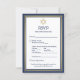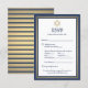 Remplissez les invitations à la mitzvah de la marine et de la barre d'or avec d'élégantes cartes de réponse RSVP. Tout le texte est simple à customiser ou à supprimer au besoin. La carte comprend les choix de repas, les allergies alimentaires, la demande de chant et l'option de réponse par le site Web ou par courriel. Le design bleu marine, or et blanc présente une fausse feuille Star of David, des rayures modernes et une typographie d'inspiration art déco classique. Cette carte de faire-part est une façon élégante de demander à vos amis et à votre famille RSVP de participer à votre prochaine célébration spéciale. Veuillez noter que l'or est imprimé en couleur et non en métal. Mazel Tov !