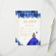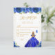 This elegant and glamorous sweet sixteen rsvp card features a beautiful princess with blonde hair and fair skin in a royal blue ball gown. The text combines handwritten script and modern sans serif fonts for a classy and sophisticated look. The floral arrangements, butterflies and gold confetti create the perfect blend of rustic and chic.