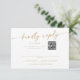 Cette carte rsvp boho chic or et blanc dans et code QR est parfaite pour un mariage minimaliste. L'or jaune neutre et le design bohème moderne blanc présentent une calligraphie rustique simple avec un style unique mais classique. Donnez à vos invités la possibilité de poster dans leur carte rsvp, ou simplement répondre en ligne avec cette carte de réponse de code QR. Entrez votre adresse Web dans la section de code QR du modèle et le code QR sera automatiquement mis à jour et lié à votre site.