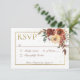 L'automne est un beau moment pour un mariage, et les couleurs de cette carte de réponse mariage le montrent. Tons terre doux de rouille, brun, tan et crème avec feuillage vert terreux et une bordure en faux or. Cette carte, qui fait partie de la Suite de cartes de bouquet Floral Automne créée par Simply Farmhouse Press, est également disponible sans la glissière d'or pour un look plus simple.