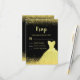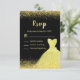 A beautiful bright yellow themed elegant watercolor dress gown on a black background with faux glitter at the top and bottom of the rsvp card.