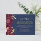 Cette élégante carte de détails mariage moderne comporte une bordure florale rouge bordeaux avec des feuilles en fausse feuille d'or. Le texte personnalisable de couleur or apparaît sur un arrière - plan bleu marine. L'envers est bleu marine solide.
