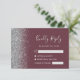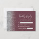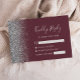 Le bord gauche de cette élégante carte d'enceinte RSVP de mariage moderne comporte une bordure en faux parties scintillant argenté. Le texte personnalisable combine écriture gris argenté, copperplate et polices italiques sur un arrière - plan bordeaux. L'envers présente un design bordeaux et argenté assorti.