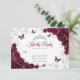 Burgundy silver floral Quinceanera RSVP reply card. Features, script font, silver butterflies, watercolor roses and tiara. Perfect for an elegant princess style glam celebration. Personalize with your own details.
