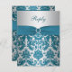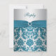 Cette élégante carte de réponse de mariage en damas gris argenté et sarcelle est ornée d'un ruban à l'aspect satiné IMPRIMÉ et d'une boucle en "diamants" IMPRIMÉS qui correspondent à l'invitation de mariage présentée ci-dessous. Le texte et le type de papier sont personnalisables. Certains papiers peuvent altérer la couleur du design. Je vous déconseille d'utiliser les papiers métallisés or, champagne ou argent, car ils assombriront le design et décoloreront le blanc des diamants sans ajouter d'étincelle supplémentaire par rapport à ce que vous obtiendrez avec le papier métallisé glace. Le papier feutre décolorera également le design. De plus, si vous redimensionnez l'invitation, ou si vous changez de police, ou la taille de la police, une partie du design et/ou du texte risque d'être coupée. Tout s'imprimera exactement comme vous le voyez sur votre écran. Je ne verrai pas votre invitation, et Zazzle ne corrigera RIEN (fautes de frappe, désalignement, etc.). Si vous avez besoin d'aide avec cette invitation, veuillez m'envoyer un e-mail AVANT