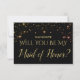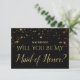 Demandez à votre ami spécial d'être la bonne d'honneur lors de votre mariage avec cette belle carte "Will You Be My Maid of Honor". Cette carte vous permet d'écrire un message spécial à votre femme d'honneur pour lui faire savoir à quel point elle est spéciale et que vous voulez vraiment qu'elle fasse partie de votre mariage. Conçu dans le cadre de notre Suite Mariage Shimmering Sparkles, dispose d'un design élégant mais fantaisiste d'étoiles roses et dorées avec du texte doré sur un arrière - plan noir.