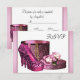 Invitation de fête d'anniversaire modèle chaussures à talons hauts et léopard rose pour femme. Cette élégante boîte en dentelle rose et noire avec des roses, des perles et des chaussures à talons hauts léopard rose fonctionne bien pour l'anniversaire de n'importe quelle fille ou femme ou événement. Personnalisez-la pour votre fête ou événement en ajoutant vos détails d'événement, style de police, taille et couleur de police, et texte au recto et au verso.