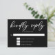 Cette carte RSVP de mariage noir chic présente une typographie blanche simple qui lit Kindly Répondre. Une carte de boîtier RSVP en gras qui comporte un script minimaliste sur un arrière - plan noir.
